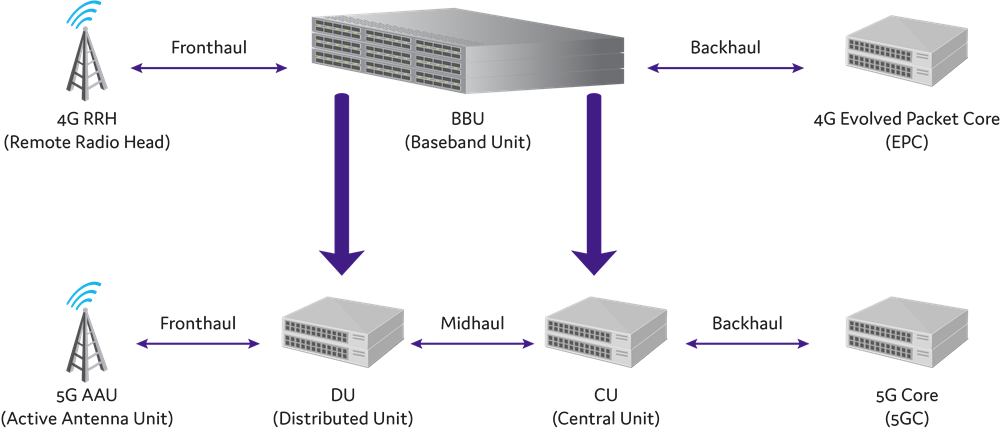 ● Back-haul – transport from the central unit to the 5G core or Evolved Packet Core.
